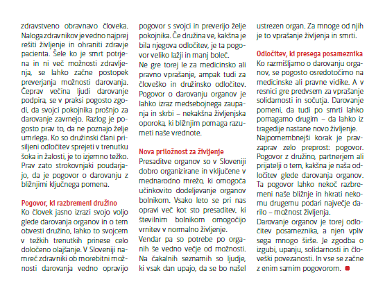 V marčevski številki revije Bogastvo zdravja novinar Miha Anžur piše o pogovoru, ki rešuje življenje. Gre za pogovor med bližnjimi, v družini, med prijatelji o stališčih in željah glede darovanja organov po smrti.