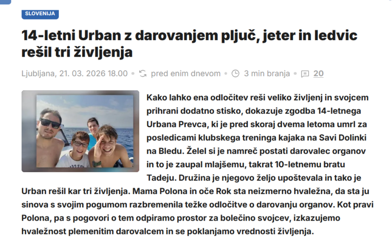 - »V najboljšem primeru lahko en človek reši tudi do devet ljudi«: https://vizita.si/novice/presaditev-organov.html?fbclid=IwAR0snNaIlMfXIvPyRVbCC9SrLwXqXBHSfsNQ_WVcf-9RlukUy2x1yrisMXM